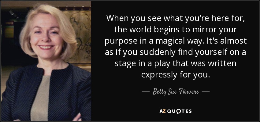 In a 1995 book by Joseph Jaworski, Synchronicity: the path to inner leadership, Betty Sue Flowers is quoted as saying, “When you realize what you are here for, suddenly the world begins to mirror your purpose in a magical way. It’s almost as if you find yourself on a stage, in a screenplay written expressly for you.”